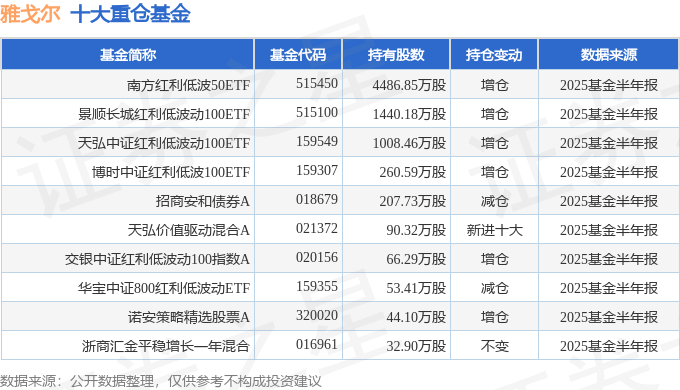 持有雅戈尔最多的基金为南方红利低波50ETF,目前规模为100.83亿元,最新净值1.4202(8月29日),较上一交易日下跌0.41%,近一年上涨19.49%。该基金现任基金经理为崔蕾。